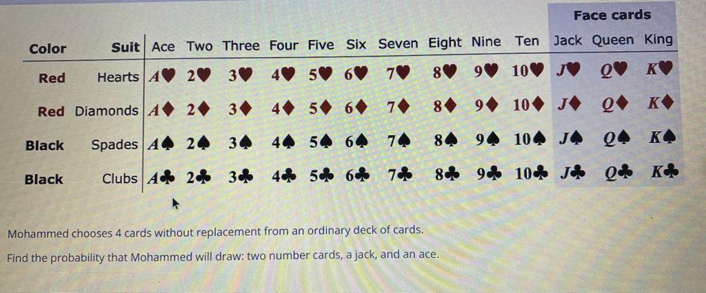 Solved Face Cards Color Suit Ace Two Three Four Five Six Chegg Com